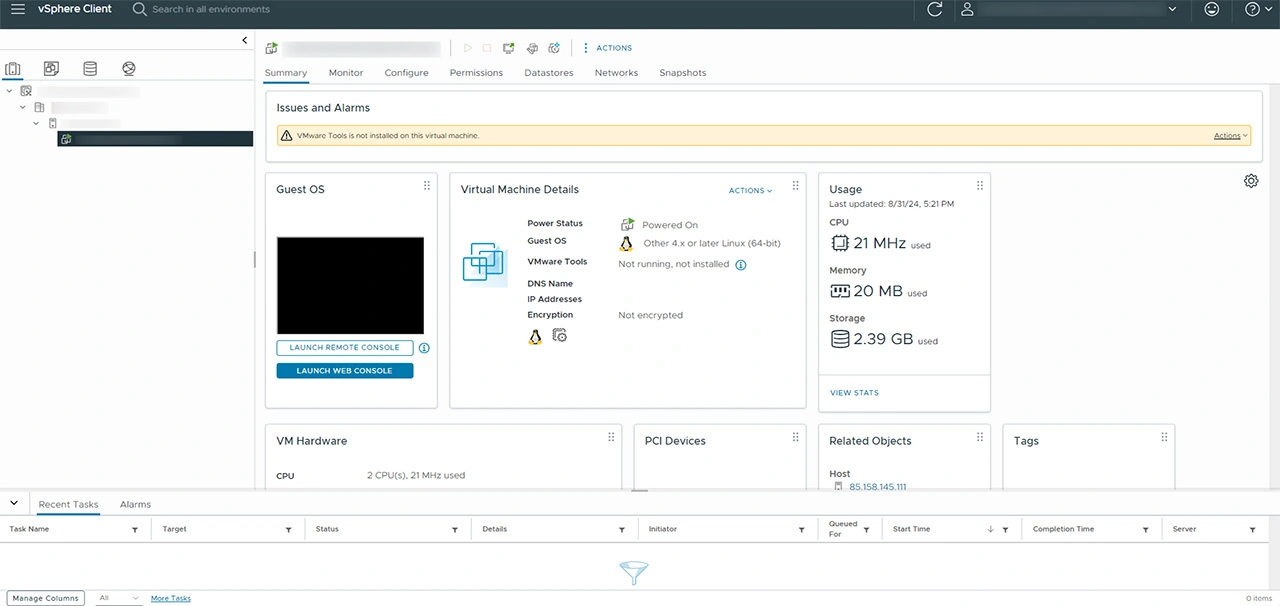 کنترل پنل vCenter از ابزارهای مهم در مدیریت زیرساختهای مجازی ساز VMware است. این ابزار برای مدیریت و نظارت بر مجموعههای مختلفی از ماشین مجازی و مجازی سازهای مختلف طراحی شده است. کنترل پنل vCenter از ویژگیها و قابلیتهایی برخوردار است که به شما کمک میکند تا سرور خود را در حالت بهینه تری مدیریت کنید. از امکانات این کنترل پنل دسترسیهایی نظیر مشاهده کنسول، ریبوت و ریست کردن سرور، اسنپ شات گیری و مشاهده مقدار مصرف منابع را میتوان نام برد.